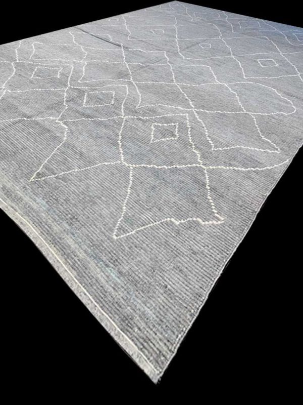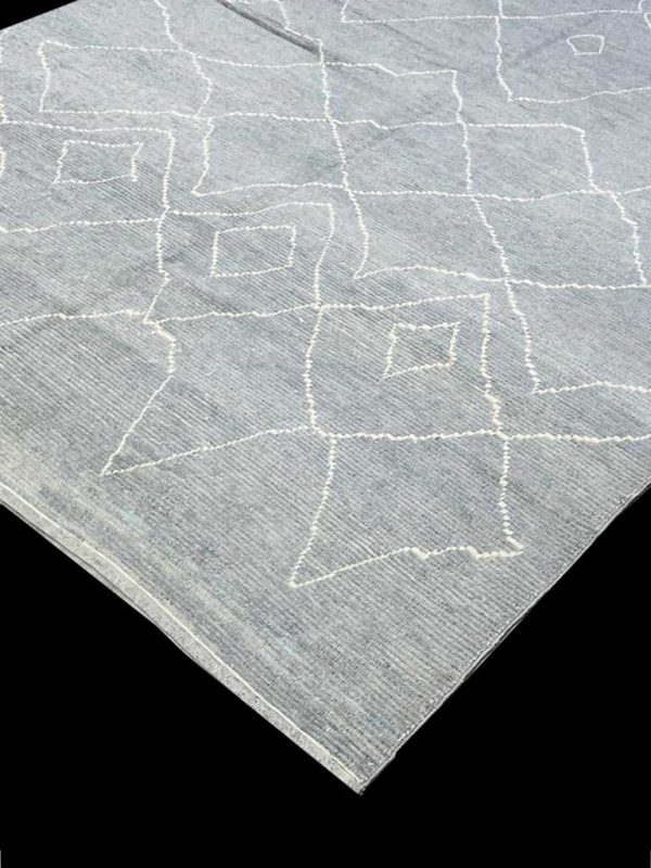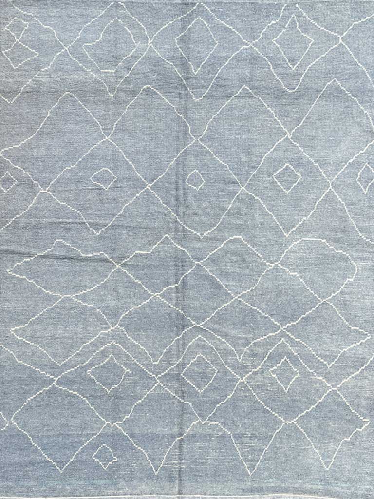 This handwoven Berber rug features a soft gray blue and a signature tribal pattern of Moroccan rugs. Â Made from high quality wool and cotton, it brings warmth and elegance to your home or office space. The design is versatile and can match a variety of furnishings, while its soft palette works seamlessly with contemporary interiors.