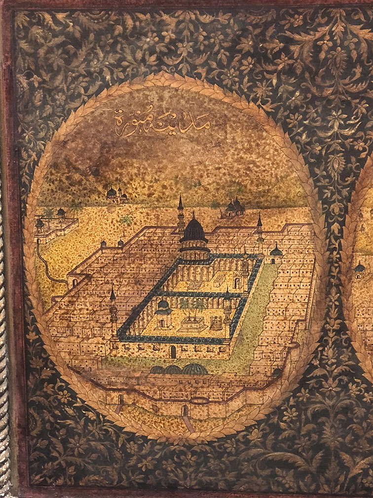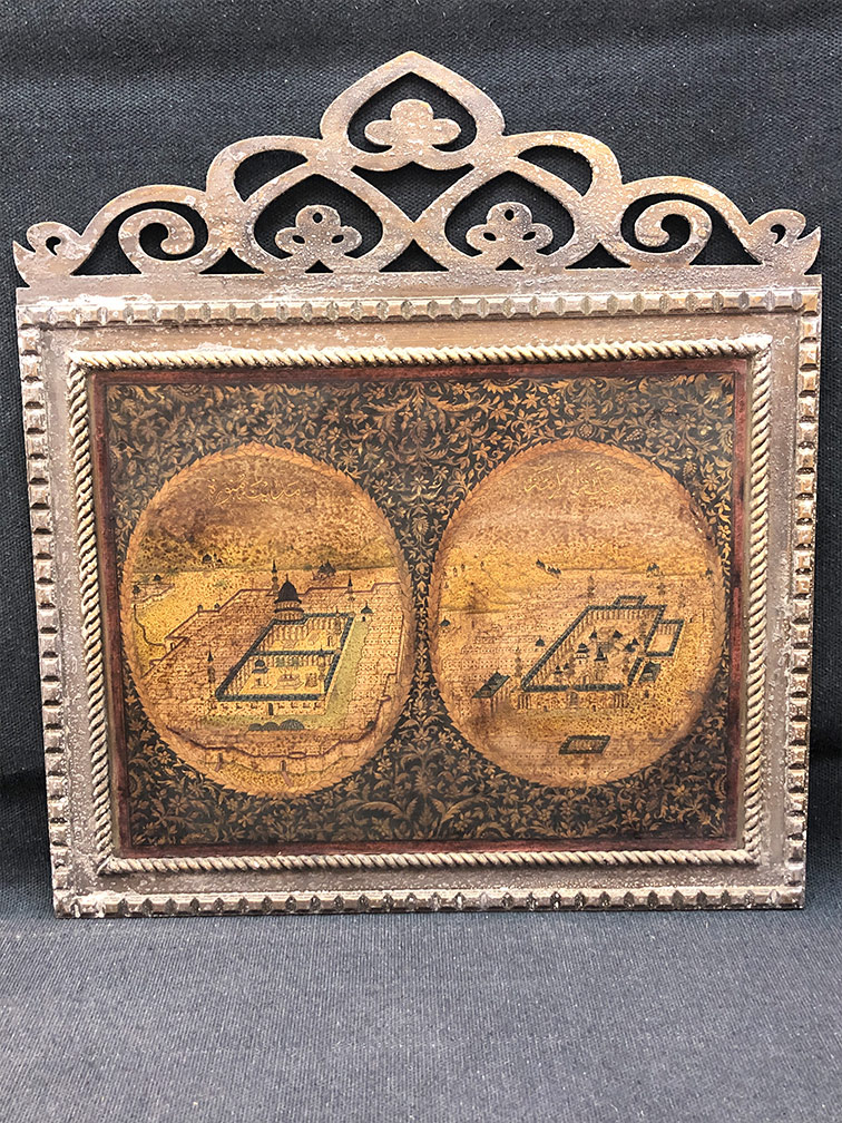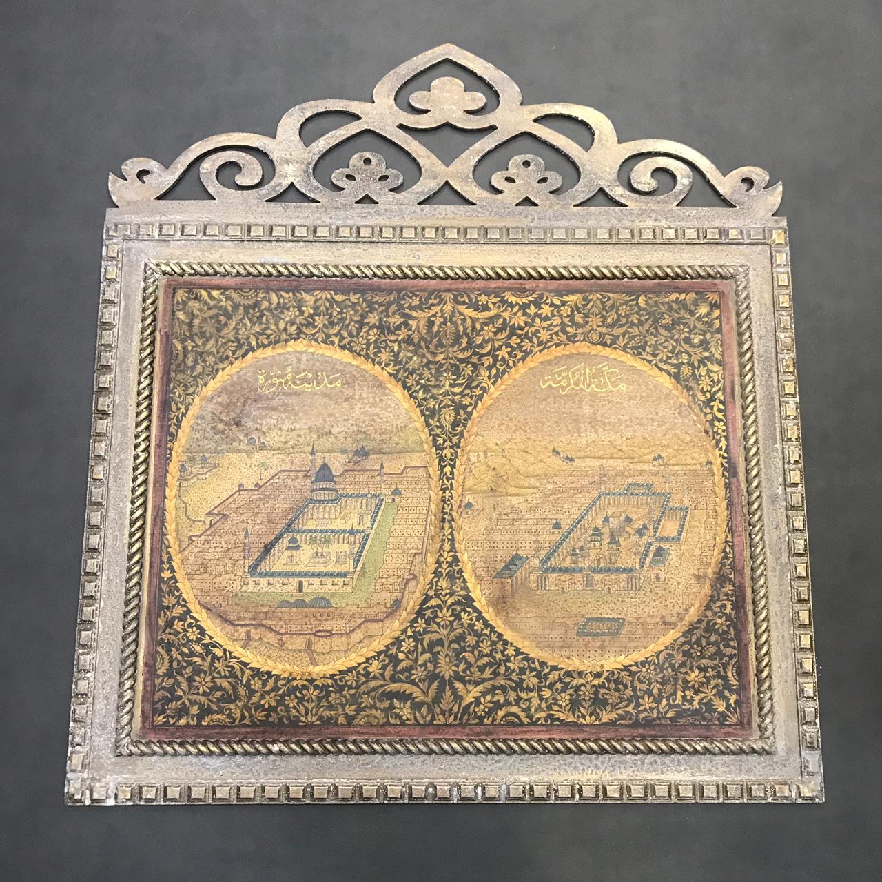 This Islamic Helia is a beautiful reminder of the rich history and culture of the Islamic world. It is also a reminder of the importance of Al-Medina to Muslims worldwide. The art features images of Al Media coupled with handmade calligraphy. It is in pristine condition, making it a rare collectible.