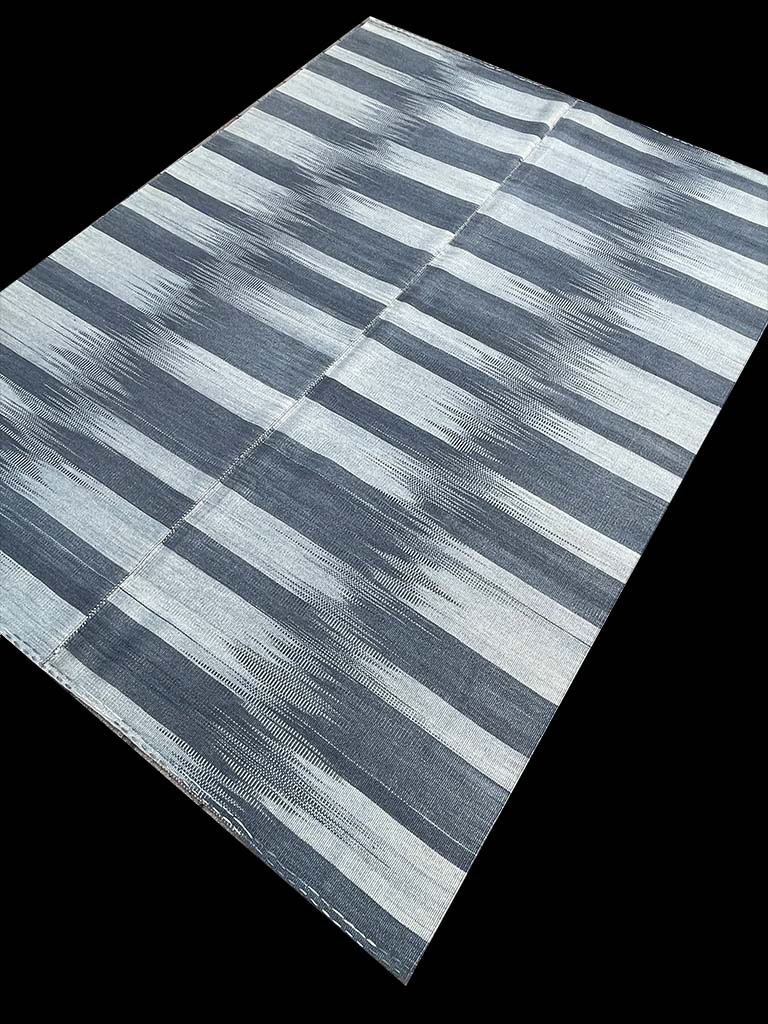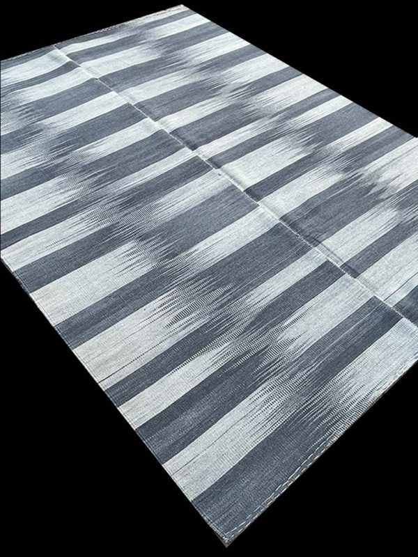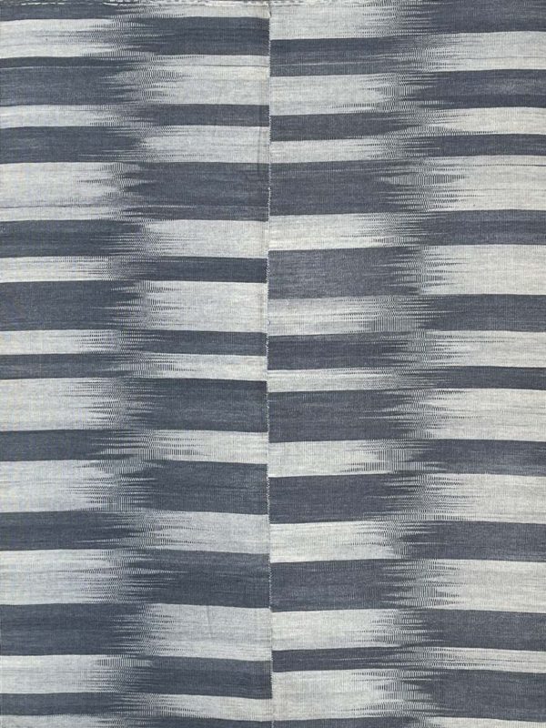 Transform your contemporary space into a sophisticated haven with the Mazandaran Kilim, a stunning handwoven rug that exudes character and style. With its captivating design of thick charcoal gray and off-white stripes, along with the signature Mazandaran pattern, this rug is truly a one-of-a-kind piece of art. Crafted from high-quality wool, this unique  Mazandaran kilim rug is both beautiful and durable, making it the perfect addition to any interior design scheme, from the living room to the office