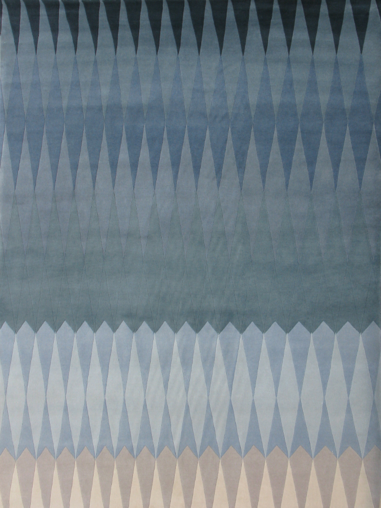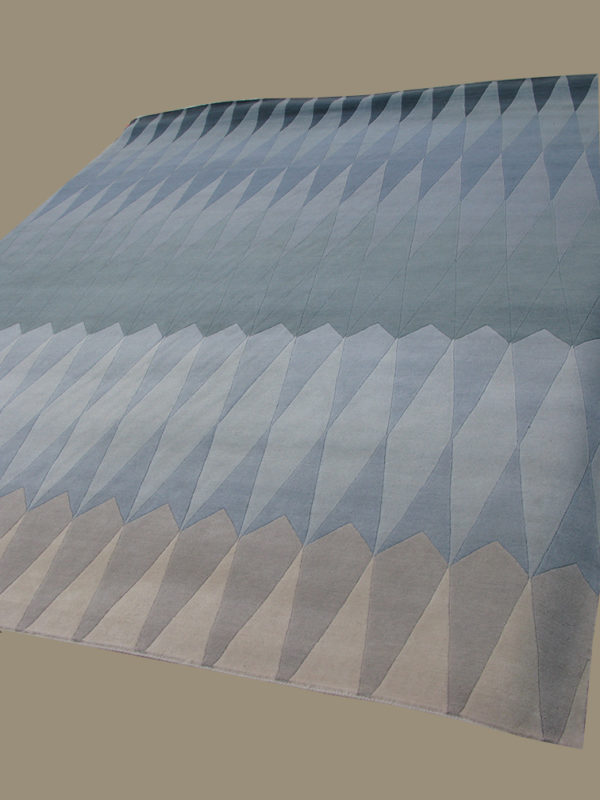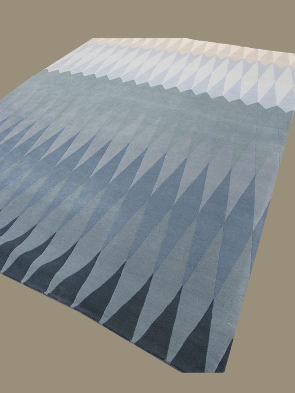 This handmade modern rug is made in India from 100% wool. It features a bold and stylish geometrical pattern in plenty of stunning shades: Blue, grey, beige, and green. With its accurate design and color combinations, this contemporary carpet makes for a versatile and elegant piece in any modern interior.