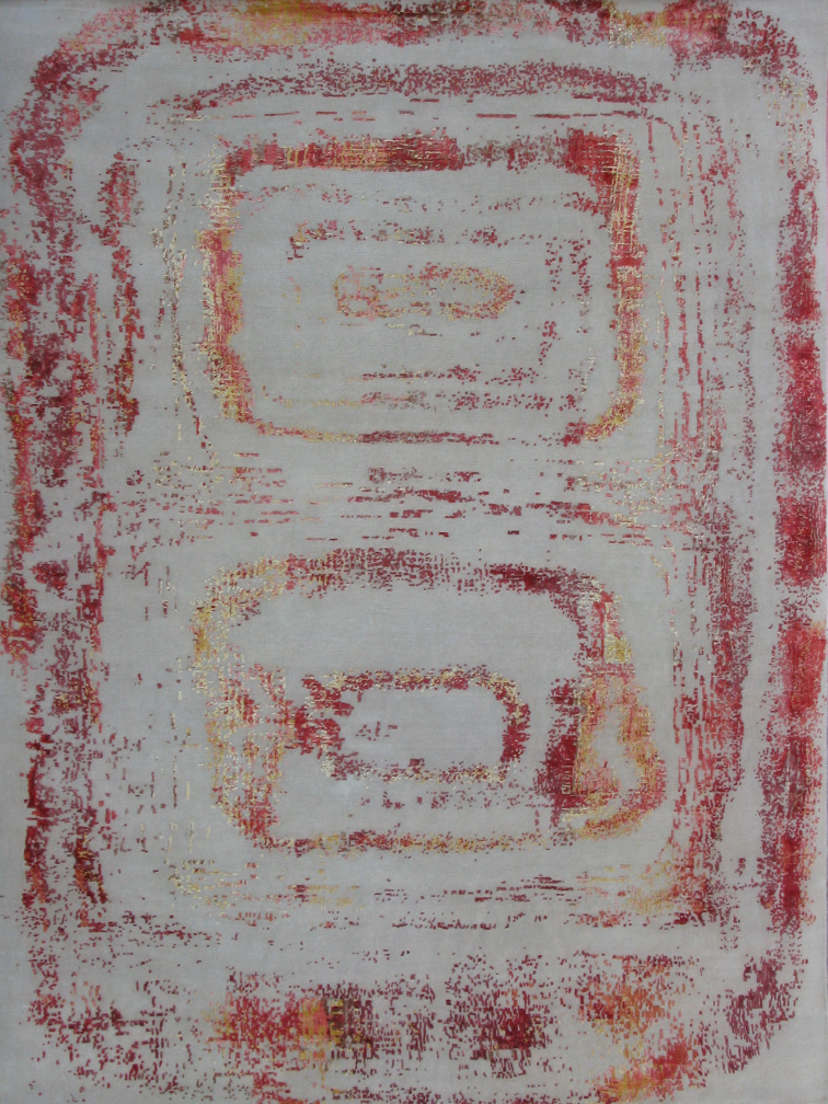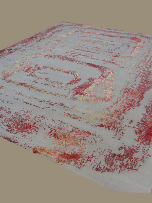 This handmade modern rug originates from India. A charming and stylish piece, this contemporary carpet looks like an abstract painting. Made to emulate thick brush strokes and paint on canvas, four stunning colors in silk and wool are knotted to perfection to create a spectacular high quality modern carpet.