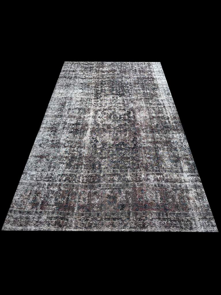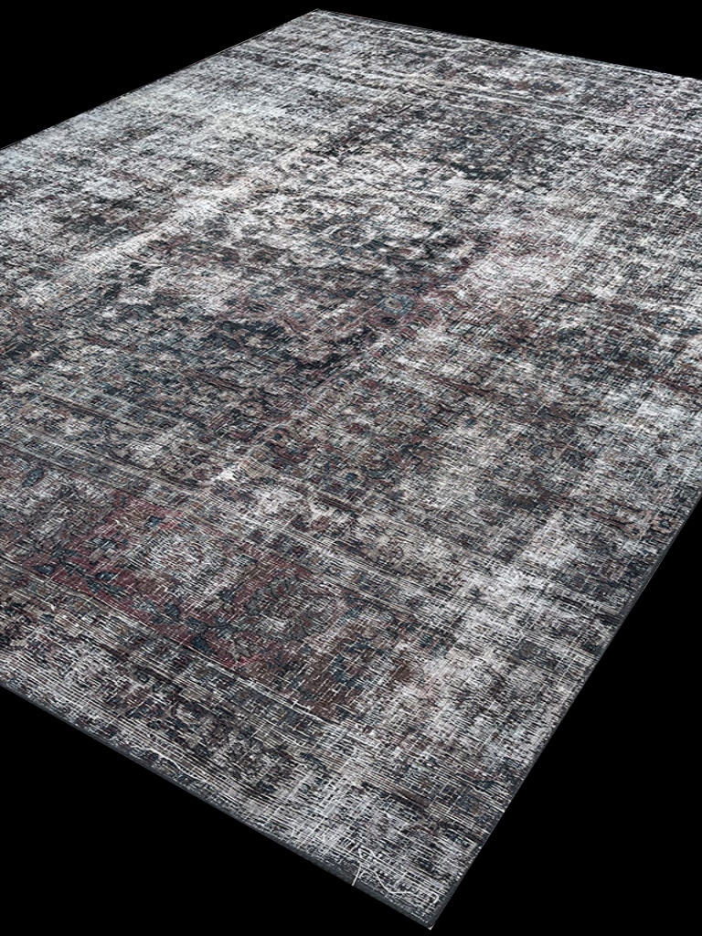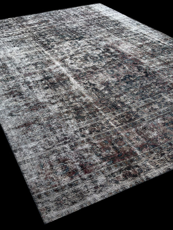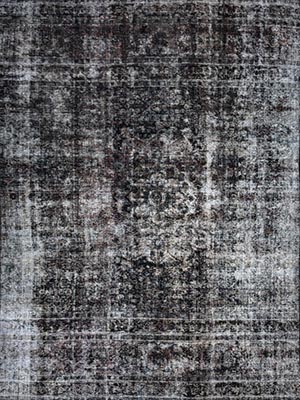 This Persian vintage carpet is a true spectacle. It has been treated to create layers of rich monochromatic patterns on top of its original design. It is predominantly dark gray. This modern carpet is surely a statement piece for a contemporary interior, with its moody tones and grainy patterns.Â