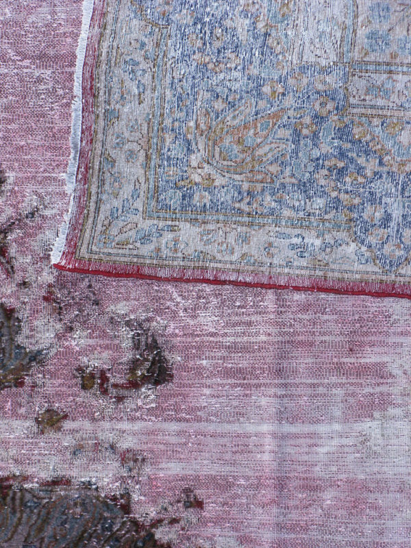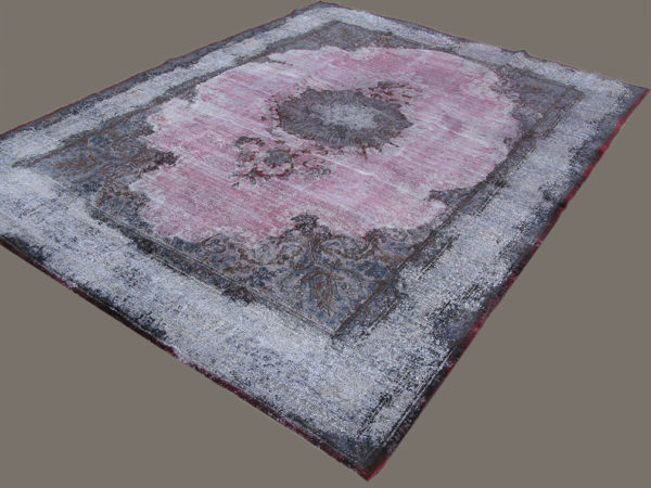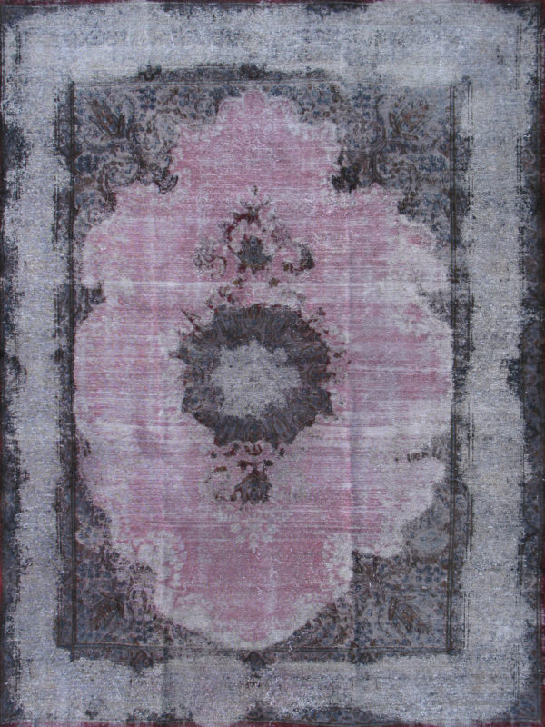 This over-dyed vintage carpet originates from Persia and is made from both wool and cotton. It has been bleached to create a faded, distressed appearance, making it suitable for contemporary interiors. The inner border has been bleached to create a “vignette”, while the center medallion has been over-dyed to highlight the antique rug’s star characteristic in a modern fashion. The blend of brown, light pink, and grey make it a versatile piece for modern spaces, matching with most neutral tones.