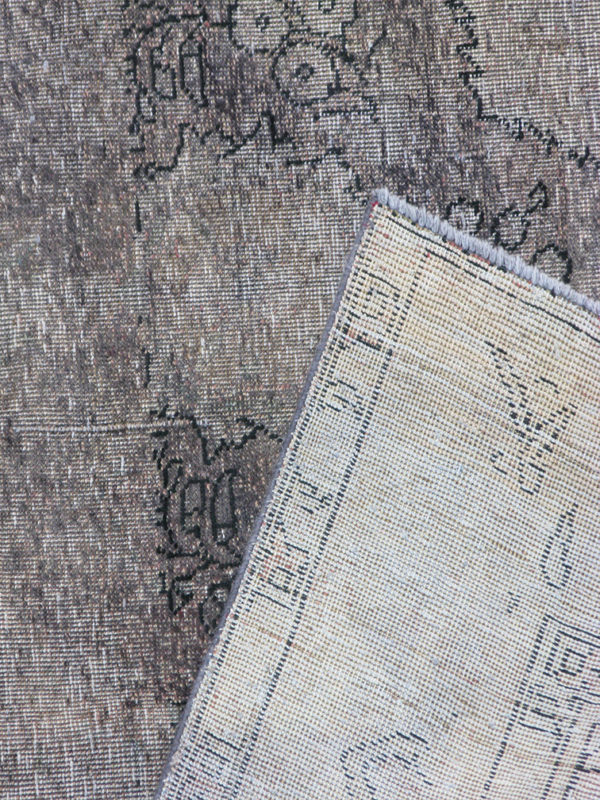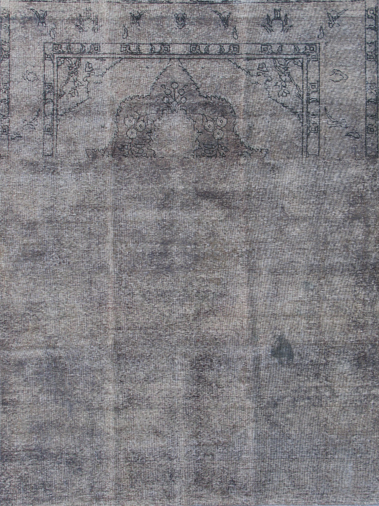 This unique vintage carpet is an interesting modern twist on the antique rug. Its original colors have been almost completely extracted, giving the rug a stunning neutral gray tone. You can see a few traces of its original Persian design, border, and pattern at the top of the rug. This modern rug is absolutely unique and complements any contemporary interior.