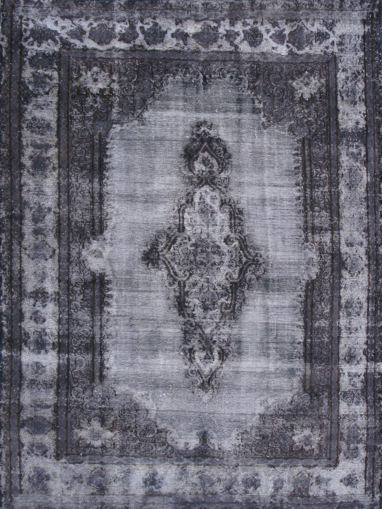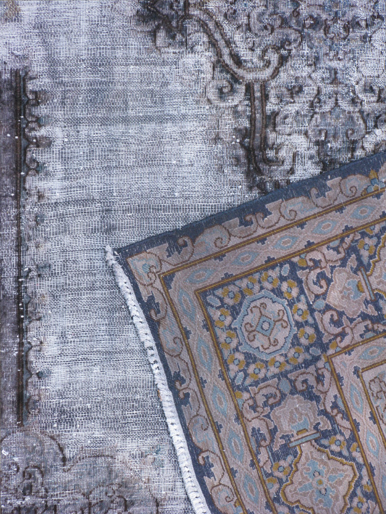 This vintage rug originates from Persia and is made from both wool and cotton. Dark colors and a sharp border give this vintage carpet its unique look, with edges that have been over-dyed to accurately frame the rug. The inner borders are bleached, highlighting the center medallion. What used to be an antique rug is now a modern carpet, bringing contemporary interiors together in style.